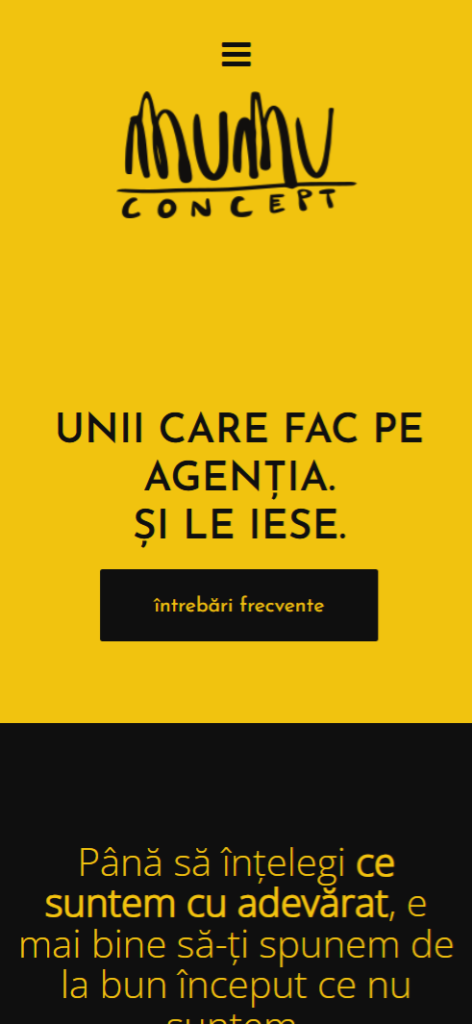 mumuconcept.ro este un proiect de agentie de comunicare, mass-media, social media, strategie de marketing, artă, tehnologie. Si sarcasm. Pentru ca sarcasmul este uneori o arma de creatie si rezistenta in fata plictiselii. Corina, George si Mihai sunt plini de idei, lucreaza foarte bine impreuna si daca sunteti un client dificil va vor face fata cu brio, pentru a da nastere unui proiect excelent de bine gandit si executat.