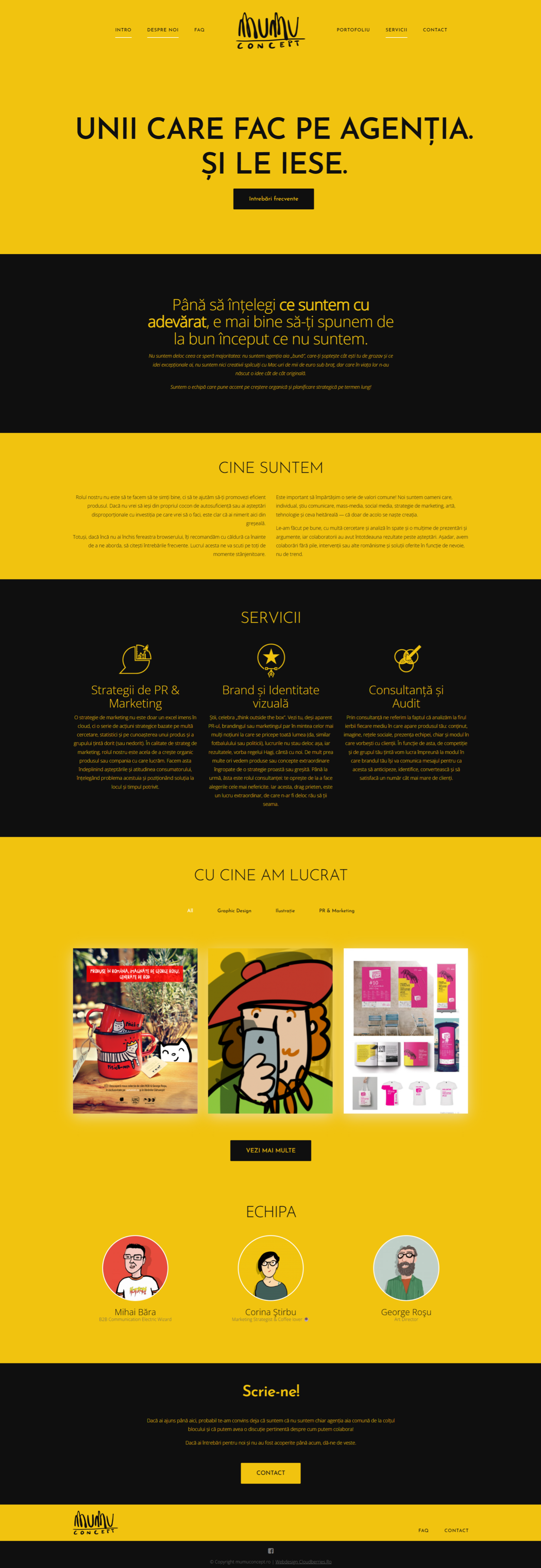 mumuconcept.ro este un proiect de agentie de comunicare, mass-media, social media, strategie de marketing, artă, tehnologie. Si sarcasm. Pentru ca sarcasmul este uneori o arma de creatie si rezistenta in fata plictiselii. Corina, George si Mihai sunt plini de idei, lucreaza foarte bine impreuna si daca sunteti un client dificil va vor face fata cu brio, pentru a da nastere unui proiect excelent de bine gandit si executat.